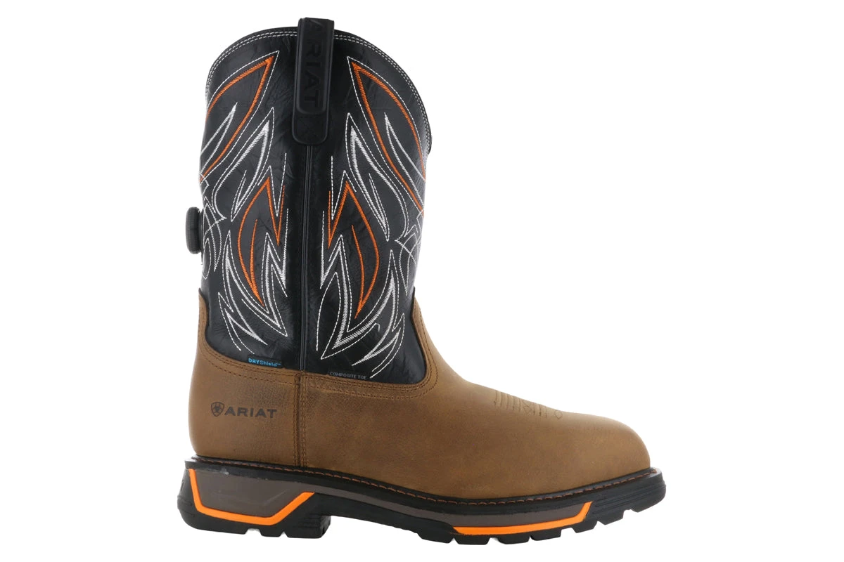 Ariat’s Big Rig BOA Waterproof Composite Toe Boot features ATS® technology to provide you with ergonomic support on uneven terrain. The DRYShieldâ„¢ waterproof construction keeps your feet dry while the durable oil- and slip-resistant Duratreadâ„¢ sole keeps you steady. Comfort features include a removable Energy Maxâ„¢ anti-fatigue insole for maximum comfort, a dual-density FLX Foamâ„¢ midsole for lightweight shock absorption and cushioning, and a Goodyear welt construction. The Big Rig keeps you protected with an ASTM safety composite toe and ASTM electrical hazard ratings. Ariat rounds off this boot with a 90° heel and a debris-releasing tread design on the outsole.Â