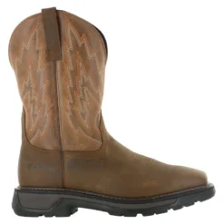 Ariat’s Big Rig Western Work Soft Toe Boot features ATS® technology to provide you with ergonomic support on uneven terrain. The durable oil- and slip-resistant Duratreadâ„¢ sole keeps you steady underfoot while also keeping you protected with electrical hazard ratings. Comfort features include a removable Energy Maxâ„¢ anti-fatigue insole for maximum comfort, a dual-density FLX Foamâ„¢ midsole for lightweight shock absorption and cushioning, and a Goodyear welt construction. Ariat rounds off this boot with a 90° heel and a debris-releasing tread design on the outsole.Â