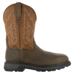 Ariat’s Big Rig Western Work Waterproof Composite Toe Boot features ATS® technology to provide you with ergonomic support on uneven terrain. The DRYShieldâ„¢ waterproof construction keeps your feet dry while the durable oil- and slip-resistant Duratreadâ„¢ sole keeps you steady. Comfort features include a removable Energy Maxâ„¢ anti-fatigue insole for maximum comfort, a dual-density FLX Foamâ„¢ midsole for lightweight shock absorption and cushioning, and a Goodyear welt construction. The Big Rig keeps you protected with an ASTM safety composite toe and ASTM electrical hazard ratings. Ariat rounds off this boot with a 90° heel and a debris-releasing tread design on the outsole.Â