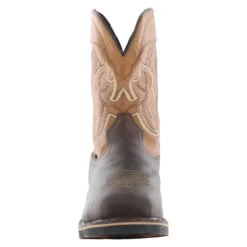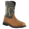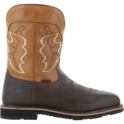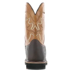 The waterproof Showdown is an 11″ composite safety toe wellington boot with a little western flair. The full grain cow soho dark brown vamp contrasts perfectly with the buff tan leather shaft. Comfort features include a premium PU memory foam removable insole, EVA midsole, moisture wicking mesh lining, and Goodyear welt construction. This boot is also packed with safety like the composite safety toe, puncture resistant plate, waterproof membrane, slip resistant outsole, and electrical hazard rating.