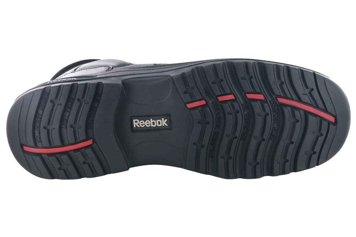 Comfort features include a removable EVA cushioned insole, rubber heel wedge and a PU cushioned midsole. The Reebok sport boot is also packed with safety features including an electrical hazard rating, abrasion resistant heel and toe guards, traction rubber outsole, and a composite toe that meets the ASTM F2413-05 standard for protective footwear.
